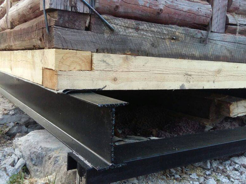 Повторно поднимаем сооружение домкратами, разбираем временные опоры и опускаем его на новый фундамент.